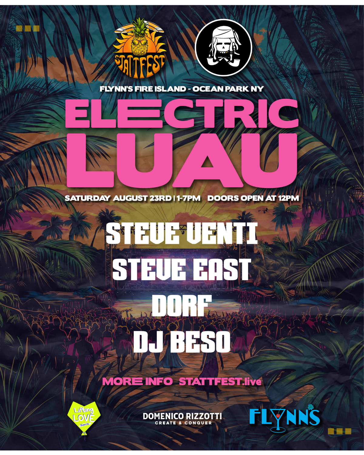 Get ready to light up the island with a tropical twist! 🌴✨ Stattfest and Flynn’s Fire Island proudly present Electric Luau—an all-day beach party packed with big beats, good vibes, and island energy. Dance in the sand and soak up the sun as DJs Steve Venti, Steve East, Dorf, and DJ Beso take over the stage for an epic afternoon of tropical house, EDM, and beachy grooves.