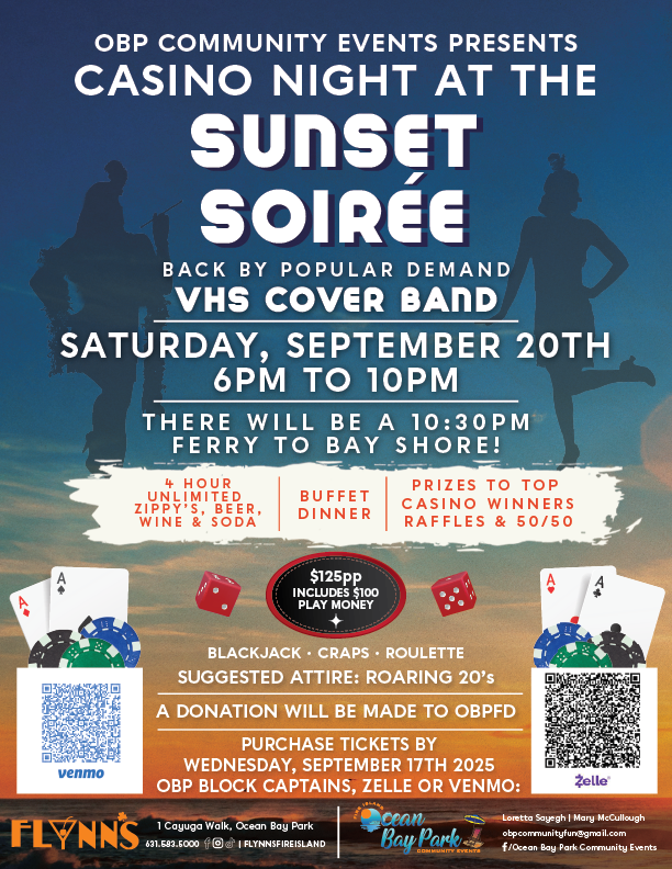 Join us at Flynn’s on Saturday, September 20th from 6–10 PM for an unforgettable night of gaming, music, and fun! Enjoy 4 hours of unlimited drinks, a buffet dinner, live music from the VHS Cover Band, and casino favorites like blackjack, craps, and roulette. Tickets are $125pp and include $100 in play money. Prizes, raffles, and a 50/50 add to the excitement—and don’t miss the 10:30 PM ferry back to Bay Shore!